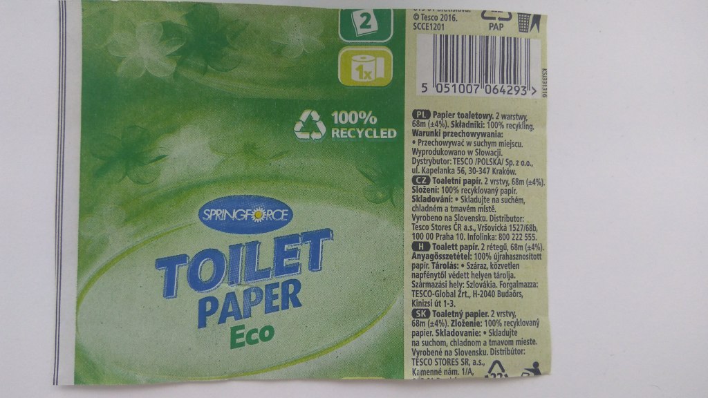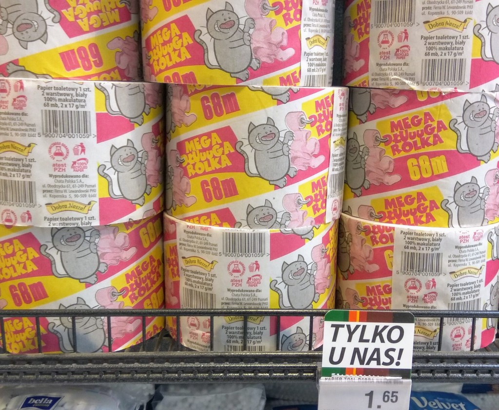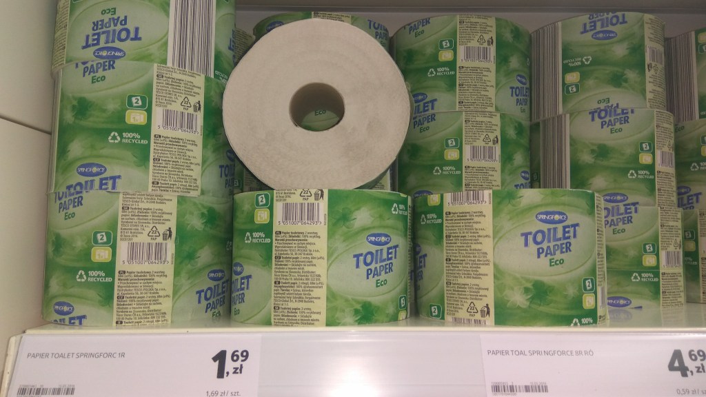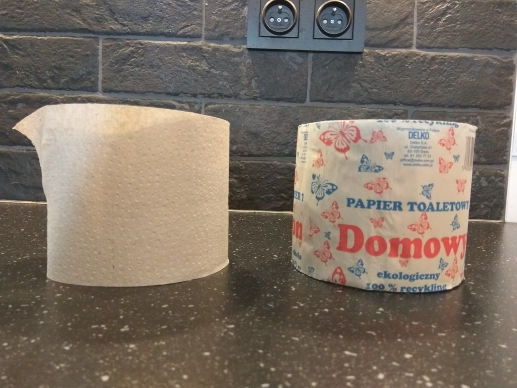 Szukaj niewybielanego papieru, w 100% pochodzącego z recyklingu. Spróbuj znaleźć rolki zawinięte w papier. PSSST! Czy wiesz, że do wyprodukowania jednej rolki potrzeba 168 litrów wody?