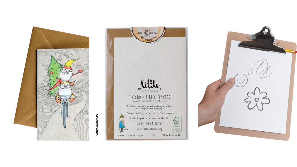 Wyślijmy je mailem lub zadzwońmy, zamiast wysyłać kartki. Życzenia wysłane mailem są tak samo pełne miłości, możemy nawet dołączyć zdjęcie lub świąteczny filmik. Jeżeli koniecznie musimy je kupić (może jednak nie?), wybierzmy kartki i koperty z recyklingu. Zanim wyrzucisz kopertę, użyj ponownie, np. zrób notes na podkładce z klipsem.