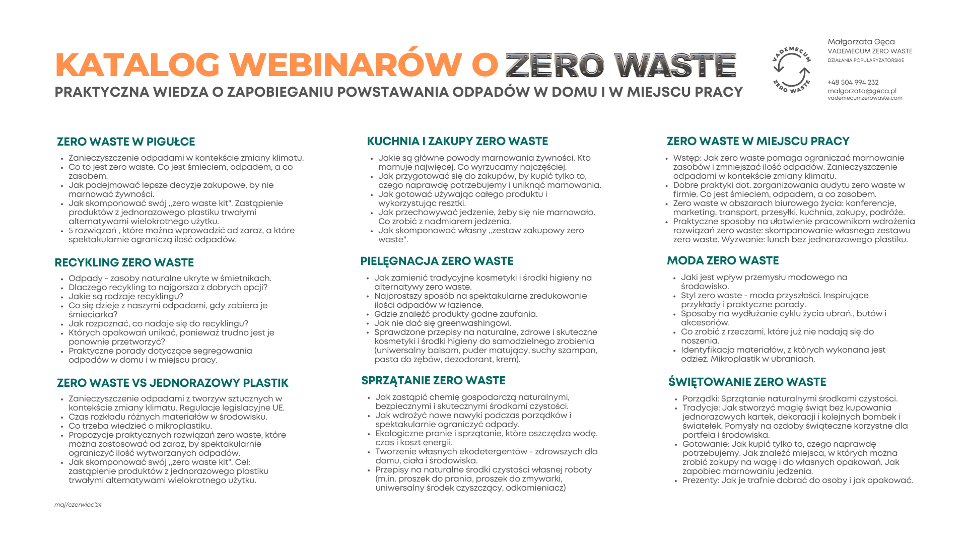 Szerokie tematycznie webinary, dostarczające wiedzy o tym, jak zamienić nieekologiczne nawyki na praktyki zero waste. Dowiedz się, jak spektakularnie zmniejszyć ilość odpadów oraz jak uprościć swoje życie. Wybierz coś dla siebie: